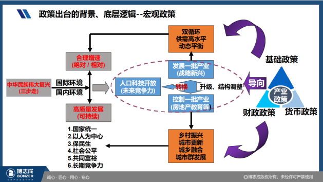產業政策落地的基礎是改革開放政策,人口政策是保障,財政政策、貨幣政策是支撐。