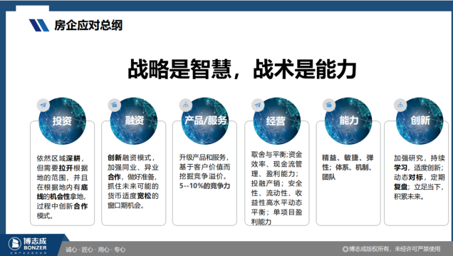 戰略是智慧,戰術是能力。房地產企業要關注投資、融資、產品/服務、經營、能力、創新的落地綱領: