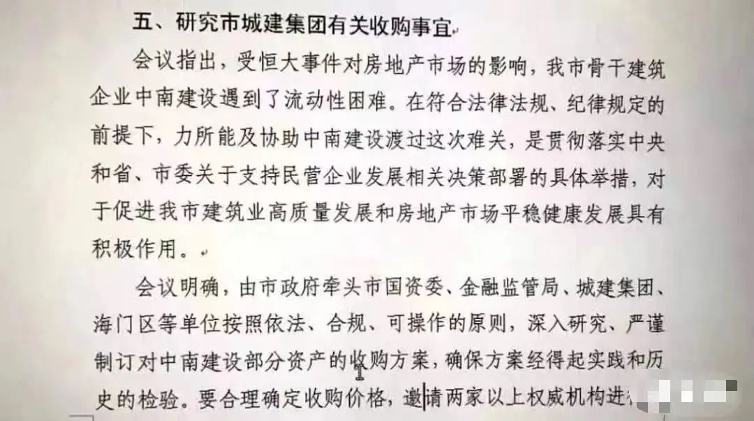 更是要求市國資委、金融監管局、城建集團、海門區等單位,按照依法、合規、可操作性的原則,深入研究、嚴謹制定對中南建設部分資產的收購方案。