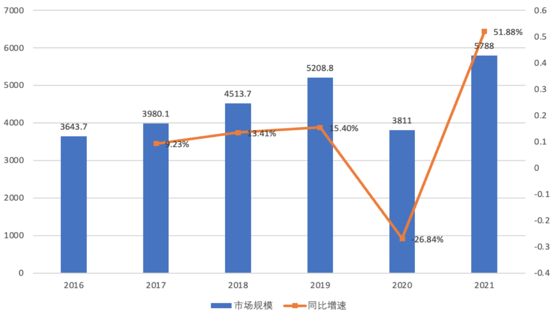 在《中國冰雪運動發展規劃(2016-2025年)》和《國家冰雪場地建設設施規劃(2016-2021)》等政策的支持下,2021年我國冰雪行業市場已達到5788億,較2020年增長了51.88%。根據目前的增速,中國將力爭2022年冰雪產業總規模超過8000億元,2025年爭取實現市場規模突破1萬億元的目標。