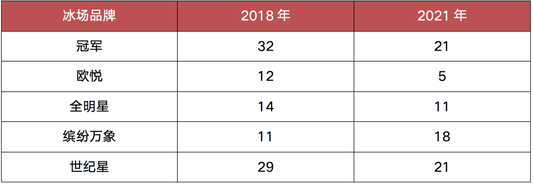 表:連鎖商業冰場品牌2018年與2021年店面數量對比