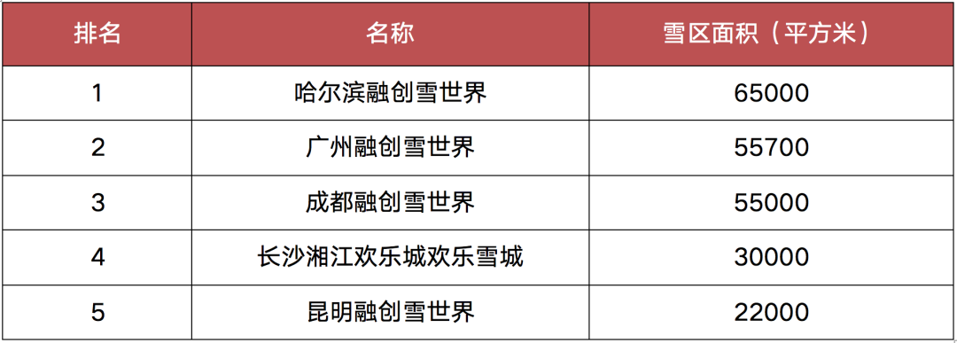 按雪區面積大小排名,全球前十位的室內滑雪場中,中國已經占據了半數。同時,雪區面積排名前三的室內滑雪場全部在中國,分別為哈爾濱融創雪世界、廣州融創雪世界和成都融創雪世界。
