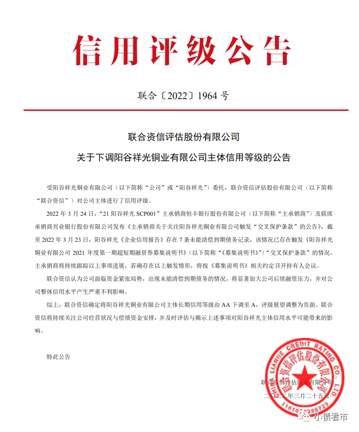 公告顯示,截至2022年3月23日,陽(yáng)谷祥光《企業(yè)信用報(bào)告》存在7條未能清償?shù)狡趥鶆?wù)記錄,已觸發(fā)《陽(yáng)谷祥光銅業(yè)有限公司2021年度第一期超短期融資券募集說(shuō)明書(shū)》“交叉保護(hù)條款”。