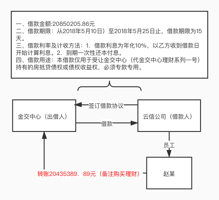 金交中心給付云信公司借款時系匯入云信公司賬戶,云信公司主張其用員工趙某的賬戶轉(zhuǎn)賬的款項為償還借款,但云信公司并未提供證據(jù)證明在還款前雙方達成由趙某的賬戶進行還款的合意;雙方員工在2018年9月10日的微信聊天記錄顯示,雙方對于云信公司用趙某名義受讓金交中心的理財產(chǎn)品,由趙某的中信銀行賬戶支付受讓款,并在轉(zhuǎn)款時摘要備注“趙某186XXXXXXXX”達成合意,云信公司現(xiàn)主張上述款項扣除9 479 155.82元,其余均為償還借款,但未提供其他充足有效的證據(jù)。因此,法院認定上述款項不是償還本案借款。