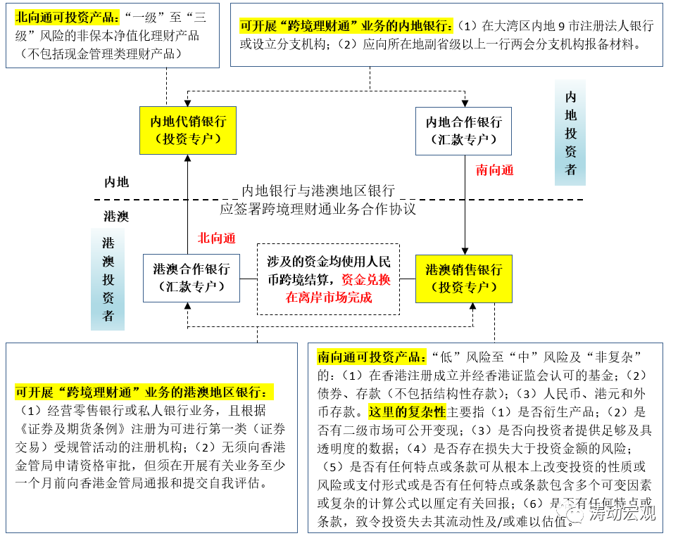 2、“跨境理財通”業務按照購買主體身份進一步分為北向通(即港澳投資者投內地合格投資產品)和南向通(即內地投資者投港澳合格投資產品),這和股市中的北向通和南向通內涵是一致的。其中,北向通是指港澳地區居民通過大灣區內地銀行開立投資專戶,購買內地銀行銷售的投資產品;南向通是指大灣區內地居民在港澳銀行開立投資專戶,購買港澳地區銀行銷售的投資產品。