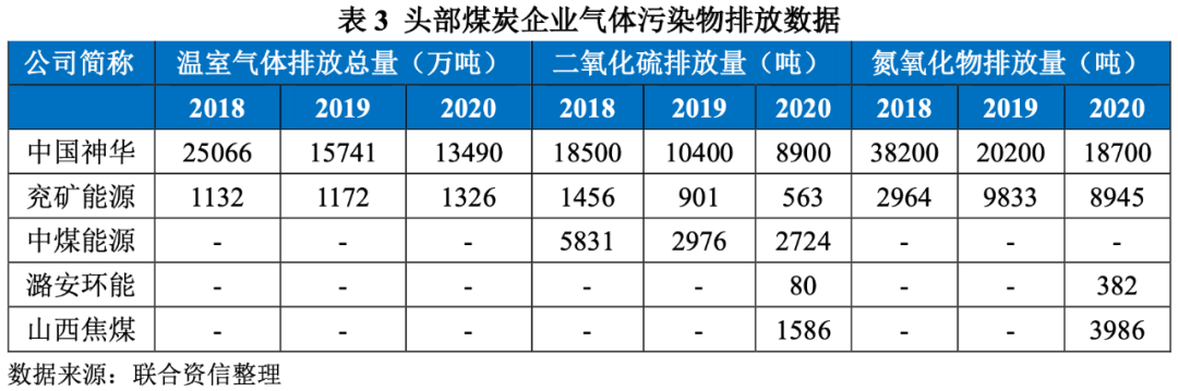 在氣體污染物排放指標中,不僅考慮排放總量,還考慮排放強度。下表展示了排放總量的數據。十家頭部煤炭企業氣體污染物信息披露率較低,中國神華與兗礦能源數據較為完整,2020年度兩家企業營業收入相當,但是兗礦能源排放量大大低于中國神華,部分原因是由于兗礦能源的海外煤礦較多。以2020年營收的結構來看,中煤能源排放強度高于中國神華。