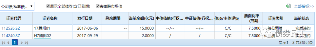 “17騰邦01”的 發(fā)行人為騰邦集團有限公司,實際控制人為鐘百勝。騰邦集團有限公司為。騰邦集團有限公司2019年6月10日發(fā)生債券實質(zhì)性違約,目前存續(xù)兩只債券,均已實質(zhì)性違約,債券存續(xù)金額為17億元。