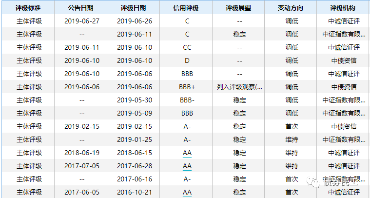 騰邦集團有限公司的主體信用評級已經(jīng)從2016年的AA下調(diào)至C,信用評級呈現(xiàn)斷崖式下跌。