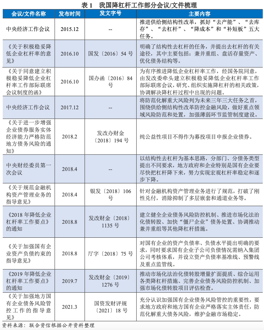 2015年12月,中央經濟工作會議將結構性改革作為經濟社會發展的首要目標,提出“去產能”、“去庫存”、“去杠桿”、“降成本”和“補短板”五大任務;2016年10月,中華人民共和國國務院(以下簡稱“國務院”)發布《國務院關于積極穩妥降低企業杠桿率的意見》的去杠桿綱領性文件;2017年,中國共產黨第十九次全國代表大會后,防范風險正式成為了我國經濟工作的主要基調,降杠桿則是供給側結構性改革中的主要任務之一。2018年,我國政府及相關部門陸續印發相應文件,降杠桿相關政策環境持續趨嚴。2021年3月,中華人民共和國國務院國有資產監督管理委員會(以下簡稱“國資委”)印發《關于加強地方國有企業債務風險管控工作的指導意見》(國資發財評規〔2021〕18號),指出要充分認識加強國有企業債務風險管控的重要性,監管企業債務及風險管控工作仍未松動。