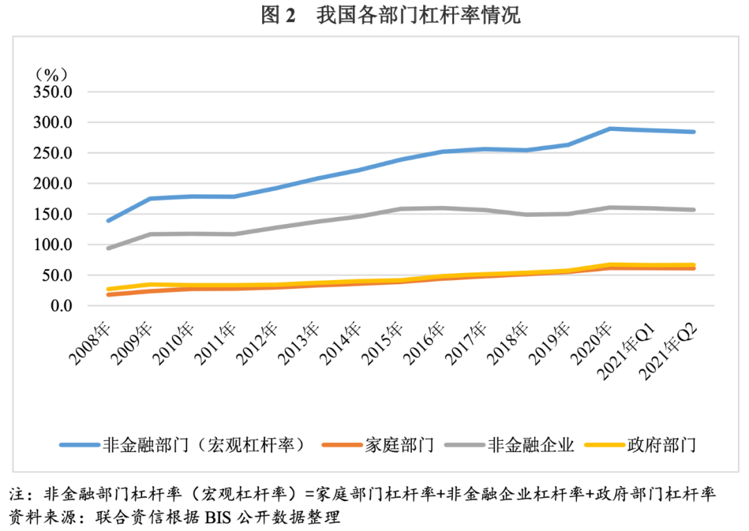 我國非金融企業杠桿率顯著高于家庭部門及政府部門,近年來非金融企業杠桿率的高企已引起我國政府的高度重視。