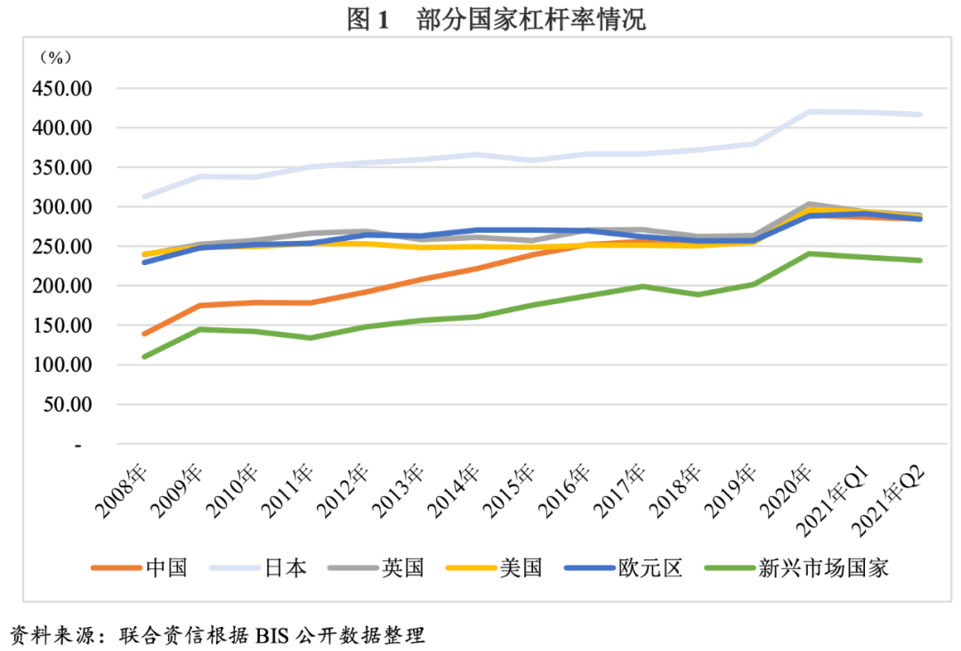 我國宏觀杠桿率經過早年的快速提升,截至2020年底已達289.6%,與英國、美國和歐元區國家水平基本相當。2021年上半年,我國宏觀杠桿率再次回落;2021年6月底我國宏觀杠桿率較2020年底下降4.9個百分點至284.7%,在BIS統計公布的44個國家和地區當中處于第20位(按宏觀杠桿率由高到低排序)。