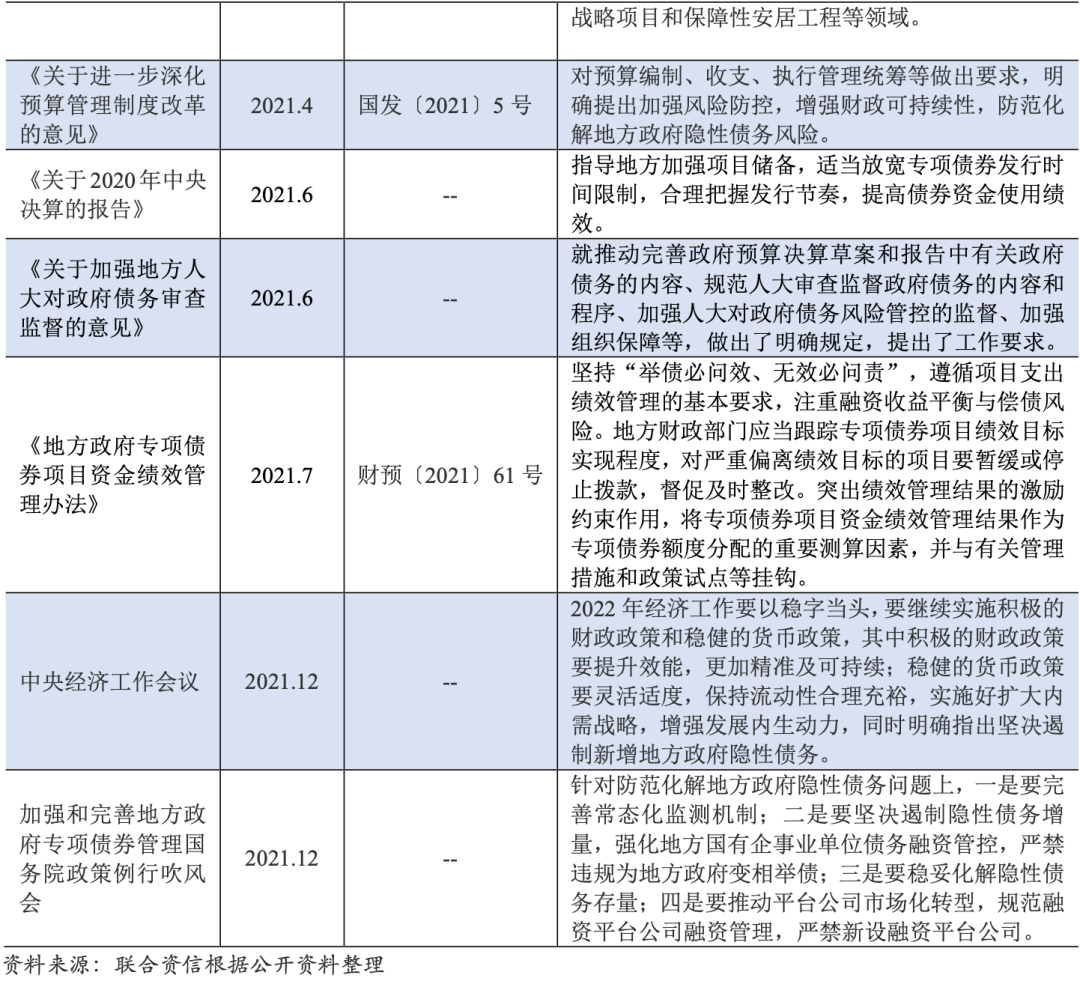城投企業是我國非金融企業中較為特殊的市場主體,其萌生至今,已成為推升地方政府隱性債務的主要力量。2014年起我國政府持續加強對地方政府隱性債務及國有企業投融資行為管理;2019年及2020年,受宏觀經濟及新冠肺炎疫情影響,逆周期調節力度加大,融資環境適當寬松;2021年以來,防范化解償債風險及地方政府隱性債務風險的工作持續加碼,對城投企業債務管理提出更大挑戰。