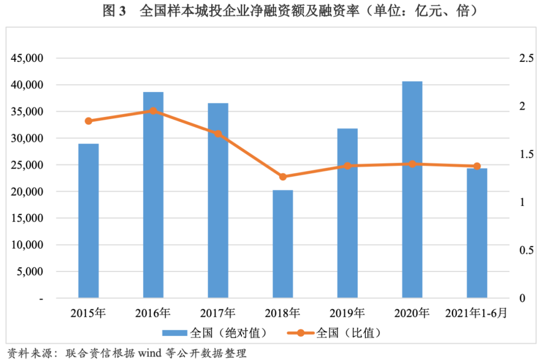 受到“三去一降一補”、結構性去杠桿等政策的影響,2017年無論是以絕對值形式還是比值形式表現的凈融資情況均較2016年有所下降。2018年,中國人民銀行和中國銀行保險監督管理委員會聯合印發《關于規范金融機構資產管理業務的指導意見》,要求規范非標債務的運行、限制債務規模的快速擴張,在各項針對地方政府和城投企業債務管理的監管政策加碼下,樣本城投企業凈融資額(絕對值)與融資率(比值)均降至2015年以來最低點,融資難度明顯上升。2019年我國宏觀經濟下行壓力上升,政府逆周期調節力度加大,城投企業緊張的融資環境有所緩解,凈融資的兩個指標均較2018年有所上升。2020年,受新冠肺炎疫情影響,基礎設施建設投資再次成為經濟增長的新動力,城投企業融資環境進一步改善,凈融資額(絕對值)達2015年以來最高點,融資率(比值)較2019年略有增加。2021年1-6月,樣本城投企業融資率(比值)較2020年略有下降。整體看,融資率(比值)因剔除了企業規模的影響,變動趨勢較凈融資額(絕對值)相比更為平緩。