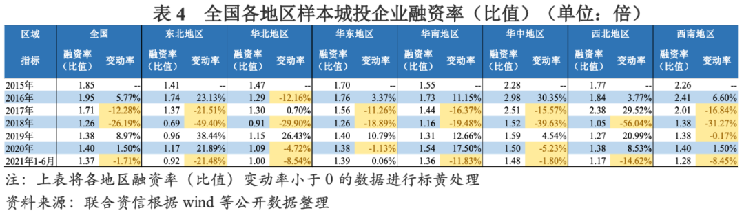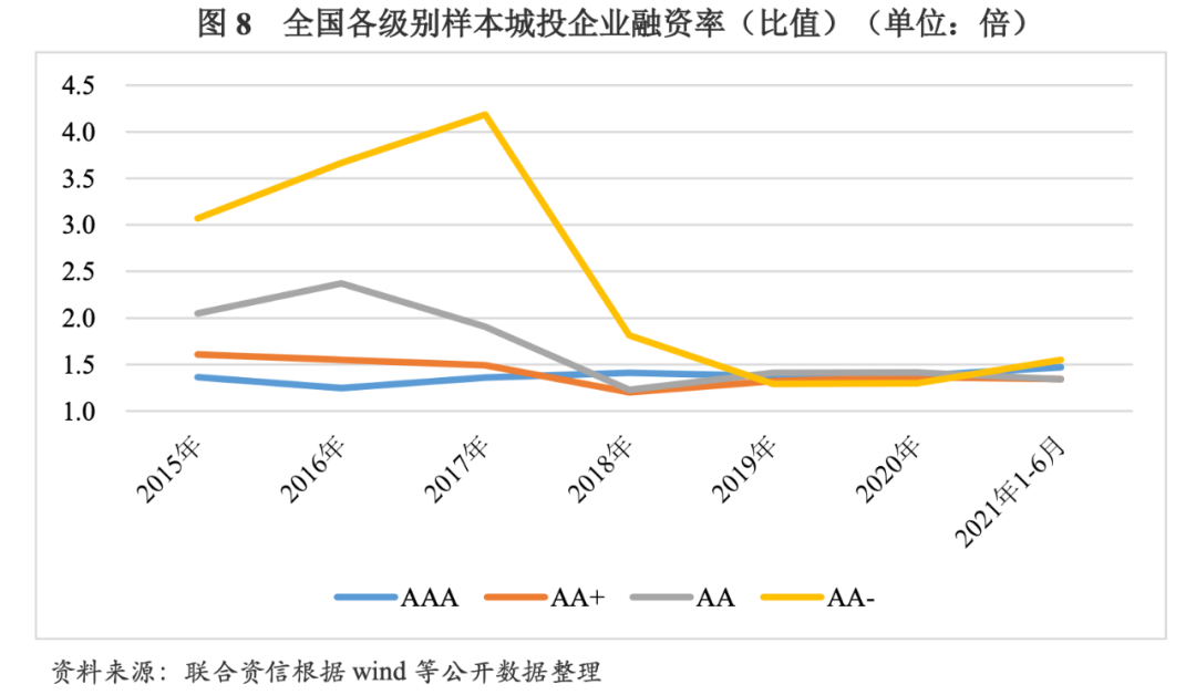 剔除企業規模對凈融資額的影響,以融資率(比值)的表現形式來分析不同級別樣本城投企業的融資情況。不同級別樣本城投企業對于政策變化的反應程度有所不同,樣本城投企業級別越高,受降杠桿政策及環境的影響越小。其中,AAA樣本城投企業融資率(比值)在1.0~1.5倍范圍內波動,表現更為平穩。AA+樣本城投企業融資率(比值)下降幅度遠低于AA及AA-樣本城投企業,2015-2018年逐年下降,2018年為1.20倍,年均降幅為9.24%;2019年至2021年上半年波動增長,2021年上半年為1.34倍。AA樣本城投企業融資率(比值)從2016年開始下降,2018年降至1.23倍,2019年及2020年略有增長,2021年1-6月下降至1.34倍。AA-樣本城投企業以2017年為變化拐點,融資率(比值)由升轉降,從2017年的4.19倍銳減至2019年的1.29倍,年均降幅高達44.44%;2020年及2021年1-6月較2019年有所增長。