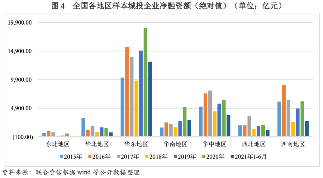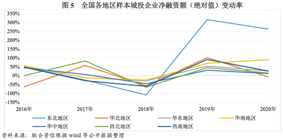 從區域分布來看,2015-2020年,華東、華南、西南地區樣本城投企業凈融資額(絕對值)變動趨勢與全國樣本城投企業變動趨勢大體一致。2016年降杠桿等綱領性文件印發后,上述三個地區紛紛響應,2017年凈融資額(絕對值)均較2016年有所減少,2018年受監管政策持續收緊的影響,凈融資額(絕對值)分別降至2015年以來最低點;此后兩年,我國加大逆周期調節力度,城投企業融資環境向好,華東、華南、西南地區樣本城投企業凈融資額(絕對值)保持增長。