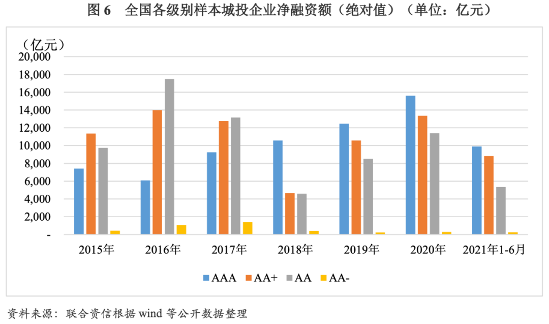 2015-2020年,主體信用級別為AAA的樣本城投企業因自身信用水平高,融資環境相對寬松,除2016年凈融資額(絕對值)同比略有下降外,其余年份均持續上升,2020年為15610.20億元,遠高于其他級別樣本城投企業。2016-2018年,受到降杠桿等政策的影響,主體信用級別為AA+及AA的樣本城投企業凈融資額(絕對值)呈逐年下降趨勢,2018年分別降至4646.21億元和4586.48億元,為2015年以來最低值;此后兩年凈融資額(絕對值)持續增長,2020年分別上升至13342.87億元和11403.22億元。主體信用級別為AA-的樣本城投企業因信用水平相對較低,凈融資額(絕對值)遠低于其他級別,2017年為趨勢變化的拐點,在降杠桿政策的大背景下,凈融資額(絕對值)由增轉降,2020年下降至297.91億元。2021年1-6月,樣本城投企業按自身信用級別由高到低排序,對應凈融資額(絕對值)依次下降。