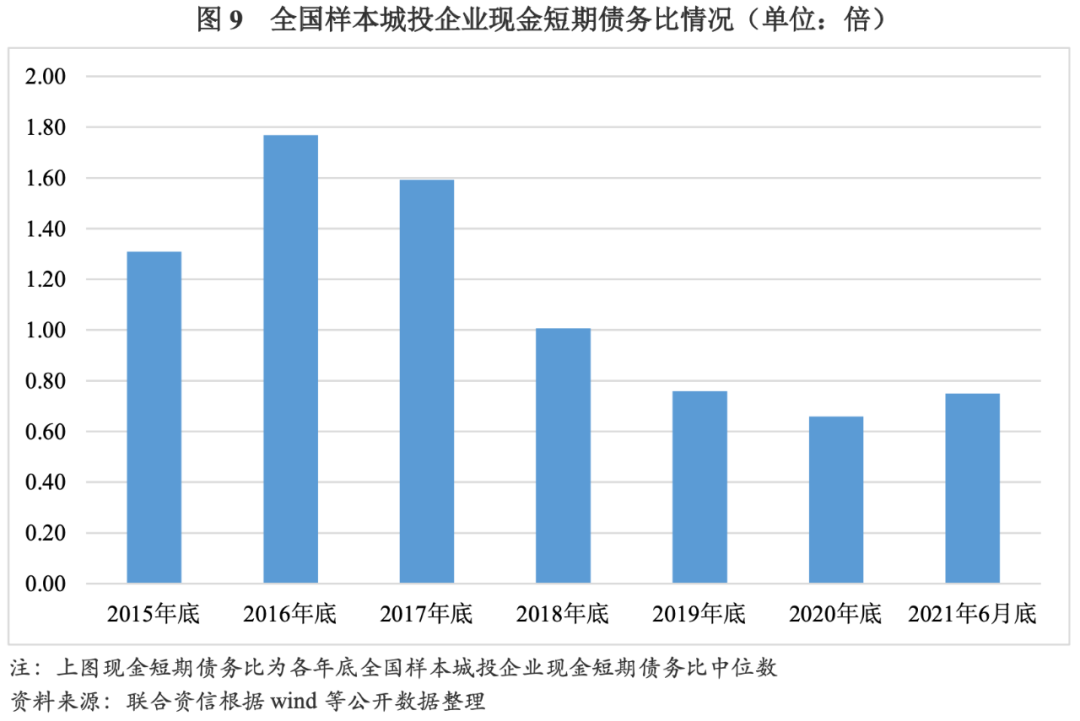 2015-2016年,全國信用政策較為寬松,2015年底和2016年底樣本城投企業現金短期債務比分別為1.31倍和1.77倍,整體流動性水平尚可。2017-2020年,在降杠桿背景下,樣本城投企業現金短期債務比呈逐年下降趨勢,由2017年底的1.59倍降至2020年底的0.66倍,城投企業流動性持續趨緊。其中,在監管政策大幅收緊的2018年,樣本城投企業流動性壓力顯著增加。2021年6月底,樣本城投企業現金短期債務比較2020年底有所上升,但仍存在一定流動性壓力。