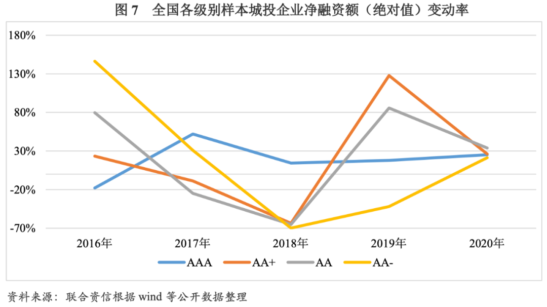 2017年,西北地區因烏魯木齊市、西安市等地城投企業基礎設施建設的融資需求較大,華中地區因軌道交通行業發展建設的需要,凈融資額(絕對值)較2016年有所增長;2018年,凈融資額(絕對值)較2017年開始大幅下降,西北地區降幅為65.26%、華中地區降幅為45.33%;2019年受到寬松政策的利好,上述地區凈融資額(絕對值)開始回升;2020年,西北、華中地區凈融資額(絕對值)均大幅增加。