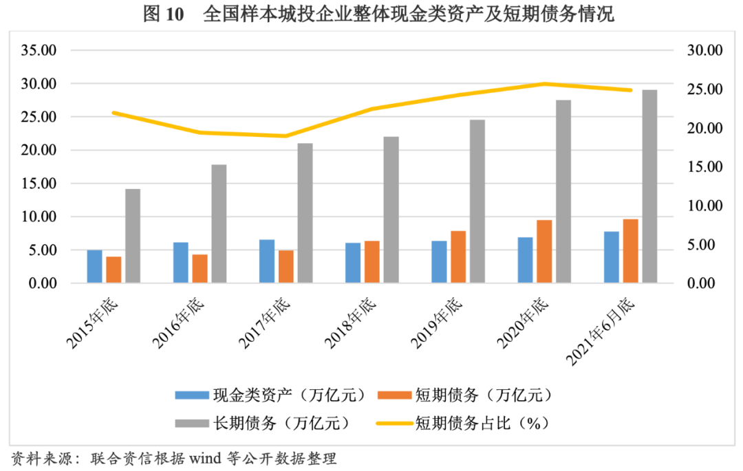 2015-2020年,樣本城投企業整體現金類資產由2015年底的4.96萬億元增至2020年底的6.88萬億元,年均復合增長8.50%,增長較為平穩;短期債務由2015年底的3.98萬億元增至2020年底的9.50萬億元,年均復合增長24.29%,增速較快,主要原因為城投企業陸續進入償債高峰期,從而導致城投企業短期償債壓力不斷攀升。從樣本城投企業整體債務結構看,2015-2020年,樣本城投企業短期債務占比以2017年為拐點呈持續上升態勢,由2017年底的18.95%升至2020年底的25.65%,側面反映出城投企業新融資獲得的資金期限有所縮短,在宏觀審慎和降杠桿的大背景下,各類金融機構及債券投資者對城投企業整體持觀望態度,對給予城投企業長期限資金支持的態度更加謹慎。