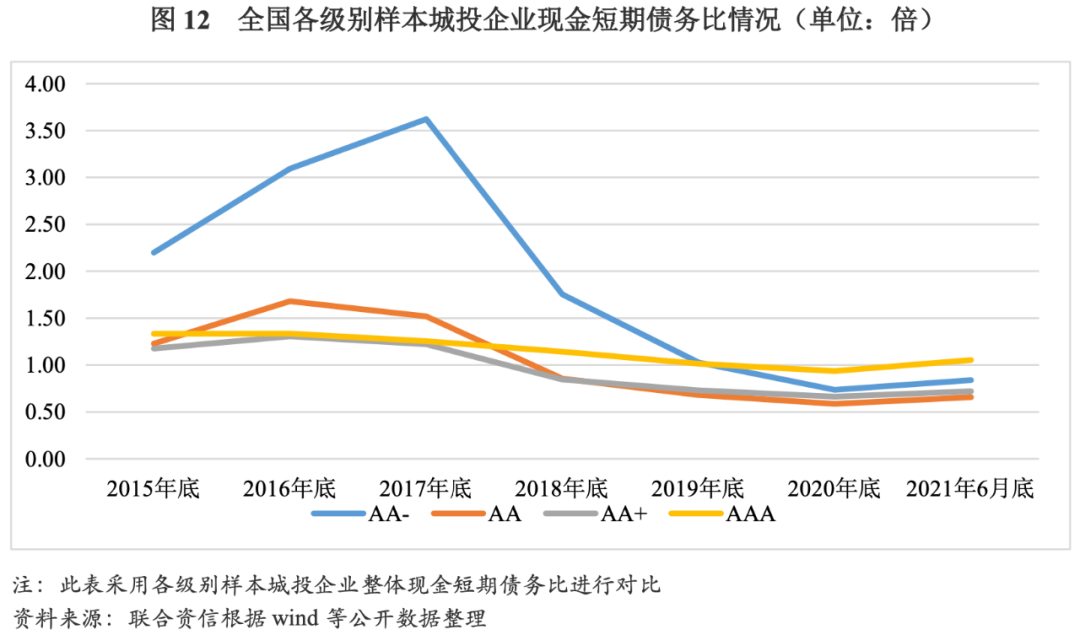 從級別分布來看,2015-2016年,不同主體信用級別的樣本城投企業現金短期債務比均不同程度上升。2017-2020年,AA-樣本城投企業現金短期債務比由2017年底的3.62倍下降至2020年底的0.74倍,降幅最大,主要系自2018年起融資渠道持續收縮所致;AA和AA+樣本城投企業現金短期債務比分別由2017年底的1.52倍、1.22倍降至2020年底的0.59倍、0.66倍,伴隨著債務的集中到期和融資難度上升,上述級別城投企業流動性壓力逐年加大;AAA樣本城投企業融資渠道相對通暢,現金短期債務比降幅有限,短期償債壓力不大。整體看,融資環境變化對低級別樣本城投企業流動性水平影響更為顯著,高級別樣本城投企業流動性水平在不同融資環境下變化則相對平緩。