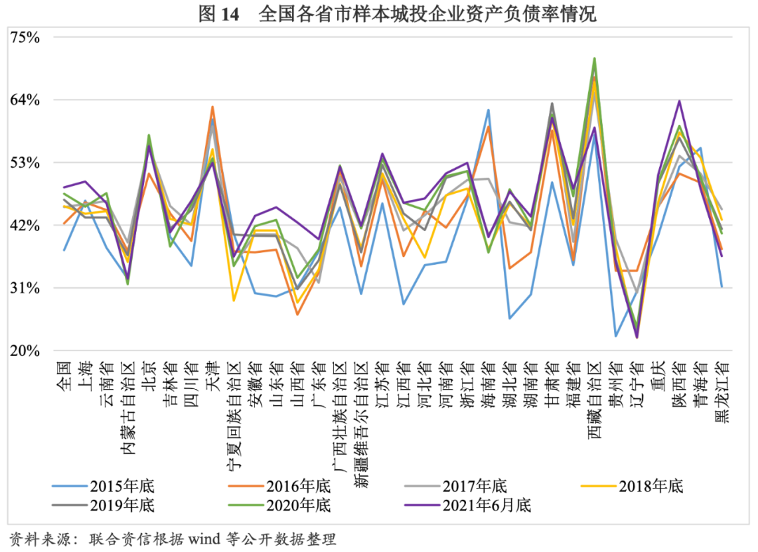 從區域分布來看,2015-2020年及2021年6月底,在降杠桿背景下各省市樣本城投企業資產負債率、全部債務資本化比率變化趨勢相近,大部分省市呈上升趨勢,但增速開始走緩。其中,地區生產總值在全國排名前列的區域,因融資渠道較寬,其城投債發行規模也較大,如江蘇、浙江、山東、湖南、四川等區域,資產負債率和全部債務資本化比率上升趨勢較平穩。同期,經濟實力較弱的地區如遼寧、內蒙古、天津、海南,當地樣本城投企業普遍存在較大的融資壓力,資產負債率及全部債務資本化比率均呈下降趨勢。