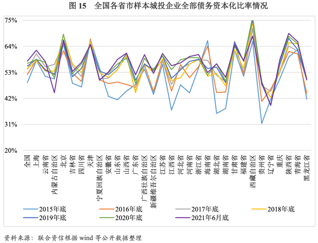 在資產負債率、全部債務資本化比率方面,樣本城投企業2015-2020年及2021年6月底的變化趨勢基本一致。2015-2017年,樣本城投企業資產負債率、全部債務資本化比率的增長幅度相對較大,杠杠水平上升較快;2018年底,樣本城投企業資產負債率、全部債務資本化比率的增幅較2017年底明顯下降,企業杠桿水平增長放緩。2019-2020年及2021年6月底,上述指標增幅略有回升,幅度均在2.0%以內。2021年6月底,樣本城投企業資產負債率、全部債務資本化比率分別為57.75%和48.61%。