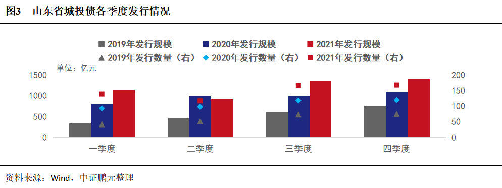 從季度發行數據來看,與前兩年情況不同的是,2021年度山東省城投公司在各季度的發行規模波動較大。2021年初市場傳出監管對城投平臺實施“紅橙黃綠”分類管控,4月末交易所發布《公司債發行審核重點》,監管環境趨嚴的背景下,二季度山東省城投公司發債數量和規模有所下降。在流動性較為寬松的背景下,三季度全省城投債發行規模環比恢復增長。