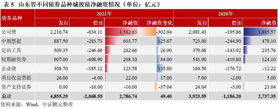 從不同債券品種凈融資來看,2021年山東省城投債凈融資仍主要由公司債貢獻,但公司債凈融資規模同比出現收縮。此外企業債凈融資與上年相比由負轉正且增長較大,是2021年拉動凈融資增長的主要動力之一。