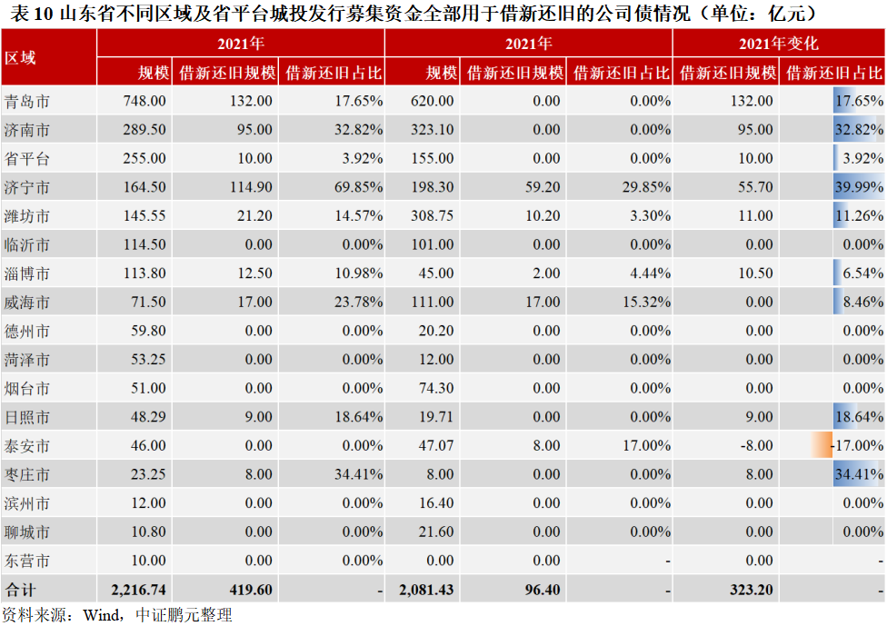 從區域來看,在2021年公司債發行規模大于100億元的區域中,濟寧、濟南、青島和濰坊募集資金全部用于借新還舊的規模占當地全部公司債發行規模的比例分別同比增加了39.99%、32.82%、17.65%和11.26%。上述區域均為地區整體債務水平偏高區域。