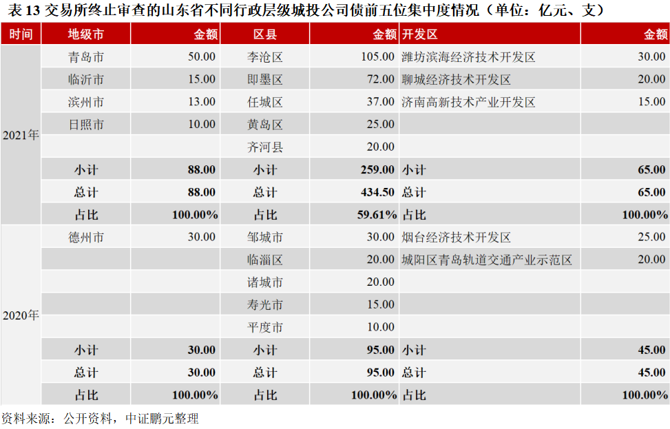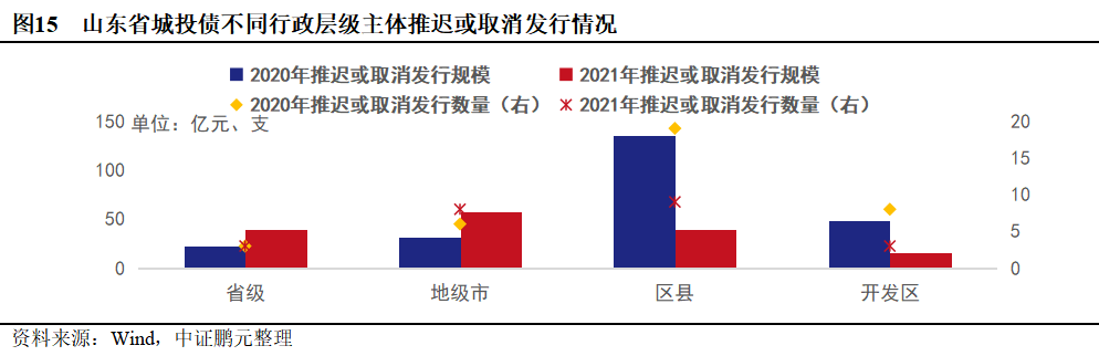 從不同行政層級主體來看,2021年山東省地級市和省級主體推遲或取消發行的城投債規模更大,但從數量上看區縣和地級市城投更多。