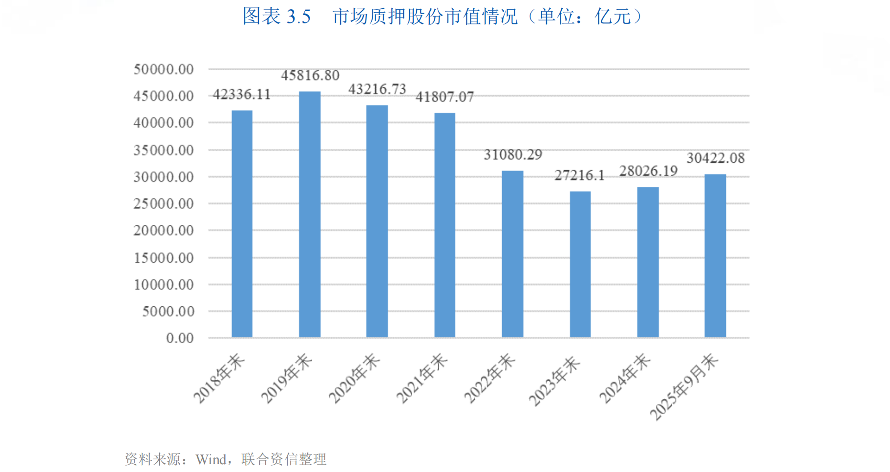 截至2025年9月末,市場質押股份市值合計3.04萬億元,較上年增長8.55%,市場質押股數占總股本比例為3.67%,較上年末下降0.36個百分點,占比處于較低水平,整體風險可控。