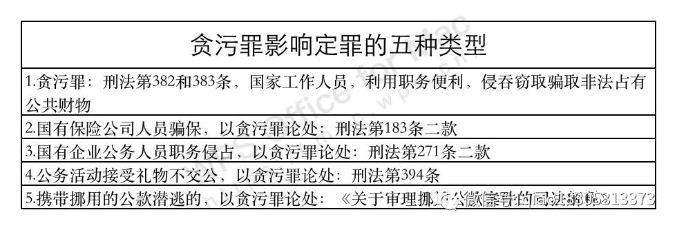 《刑法》382條和383條規定了貪污罪的表現形式處罰標準,另外,還有三個條文明確以貪污罪論處,包括第183條二款的國有保險公司人員騙保,第271條二款國企人員職務侵占,第394條公務活動接受禮物應交公而不交公。《關于審理挪用公款案件的司法解釋》規定了攜帶挪用公款潛逃的以貪污罪論處。