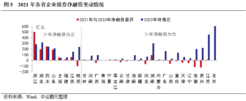 從地區分布看,2021年企業債凈融資依然呈現兩極分化,其中,8個省份凈融資為正,另有8個省份本年度尚未發行企業債。具體來看,浙江實現凈融資398.01億元,遠高于其他省份,其次是湖北和四川分別實現凈融資281.57億元和273.51億元,位居第二、第三。此外,上海因償還規模較小,實現凈融資規模99.87億元,位居第四。而江蘇因償還規模較大,凈融資規模為-184.87億元。青海、甘肅、黑龍江、海南、內蒙古、山西、遼寧和西藏本年未發行企業債,其中遼寧省累計償還109.51億元,償還規模較大。與2020年相比,12個省份凈融資規模出現增長,18個省份出現下降,其中,浙江和四川凈融資規模明顯增長,貴州、安徽和陜西的凈融資較上年出現明顯下降。北京、江蘇、湖南、湖北等省份,2022年待償還企業債規模較大,需關注償還壓力較大,且2021年凈融資出現下滑的地區。