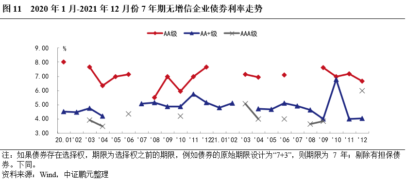 2021年,企業債券最高發行利率為8.00%,與上年下降50BP;最低發行利率為3.05%,較上年上行66BP。分債券級別來看,與上年相比,各級別企業債平均發行利均下行,平均發行利差均收窄,其中AA和AA+級較AAA級降幅較大。