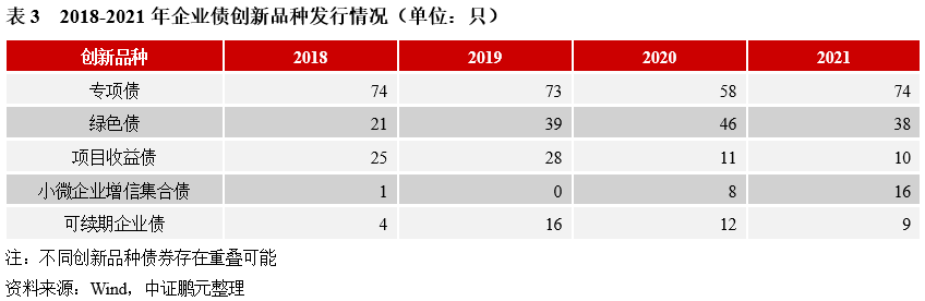 2021年企業債創新品種合計144只,較上年增加14只,占比29.3%,較上年下降4.3個百分點。第一,發改委專項債是企業債市場主要創新品種,在全市場占比約15%。其中,停車場建設專項債券37只,是專項債主要品種;縣城新型城鎮化建設專項債券14只,為新增的專項債創新品種;另外,農村產業融合發展專項債券8只,較往年明顯增長,而地下綜合管廊建設專項債券本年發行4只,較往年出現明顯下降。第二,小微企業增信集合債受政策推動,2021年發行數量增長100%。主要由地級市城投公司發行,2018年來,共有12家地級市城投公司發行14只小微企業增信集合債,占比56%。第三,綠色債受政策推動,2018年來呈現增長,2021年數量有所減少。“碳達峰、碳中和”目標的提出,進一步推動了綠色金融的發展,2021年綠色債券發行規模3720.85億元,較上年增長115%。其中,綠色企業債發行38只,較上年下降17%。與其他債券品種的快速增長有關。