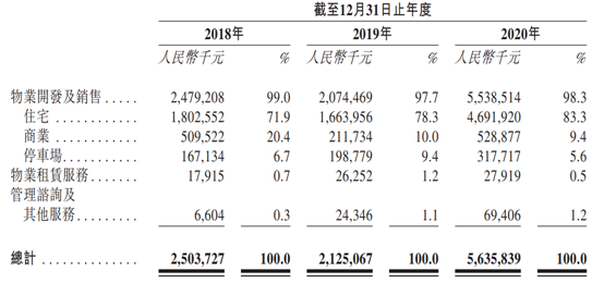目前,物業開發及銷售仍是中億基業的主營業務,占比基本維持在啊99%左右,其中住宅物業又是大頭,2018-2020年分別占其營收的71.9%、78.3%、83.3%,有越來越集中化的趨勢。