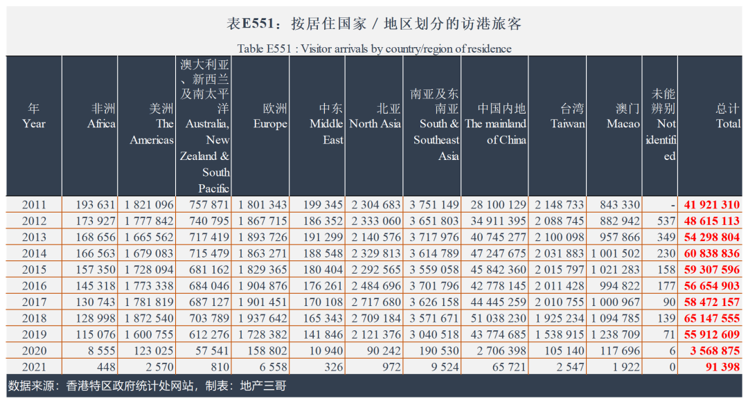 訪港游客人數從2018年的6500萬,2019年5600萬,到2020年350萬,到2021年9萬。