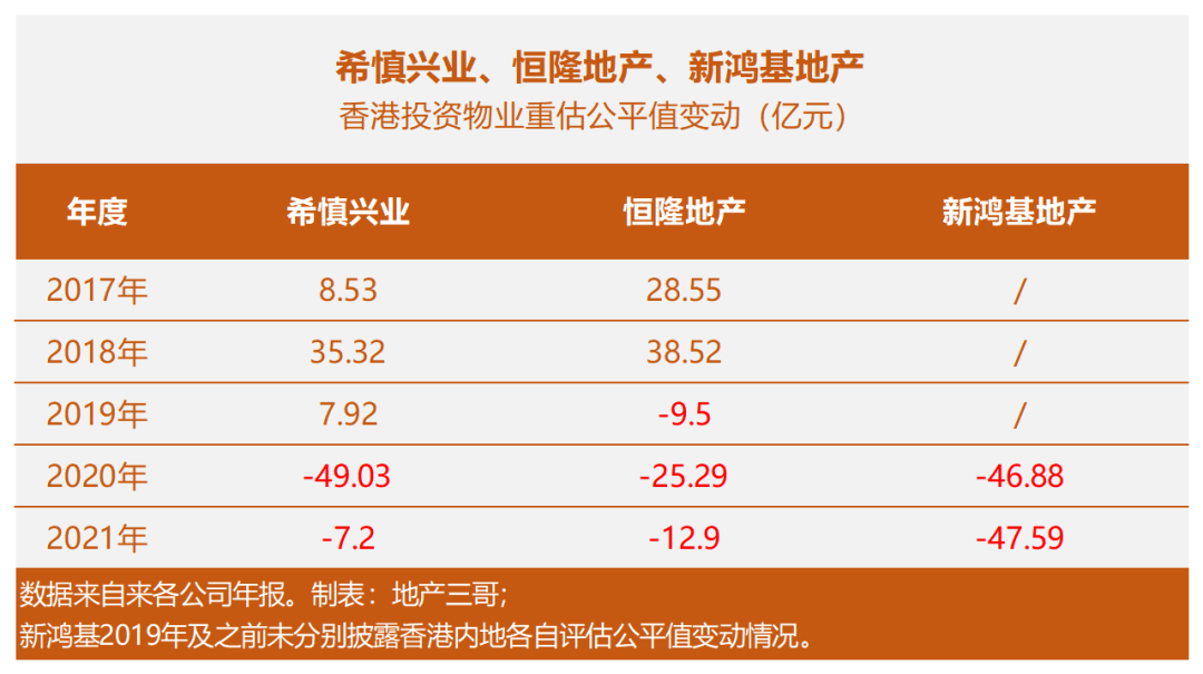 2020年、2021年希慎興業、恒隆地產、新鴻基地產都錄得了不同程度的公平值虧損: