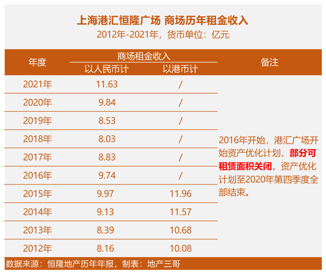 單純看商場版塊:港匯恒隆廣場歷年來租金穩步上升,2017-2020年,因為改造,關閉部分可租賃面積,因此整體租金下降。