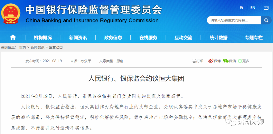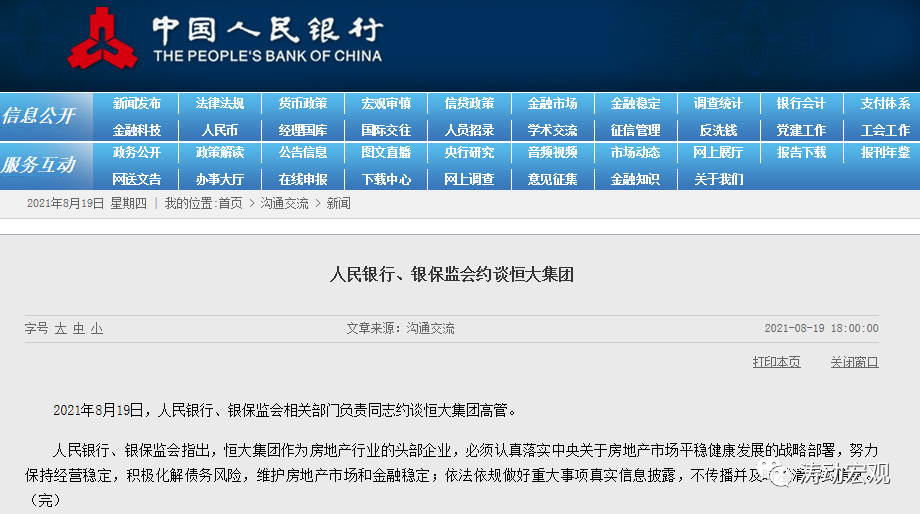 2021年8月19日,央行和銀保監會官網發文“人民銀行、銀保監會約談恒大集團”。