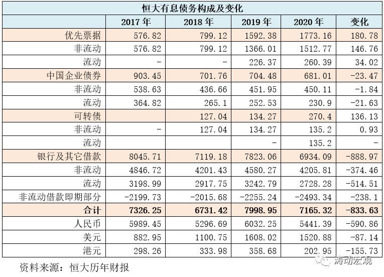 2、從有息債務的結構來看,從高到低依次為銀行及其它借款、優先票據、企業債券以及可轉債等四個部分,2020年全年銀行及其它借款累計壓降了888.97億元,是恒大有息債務壓降的主要部分。