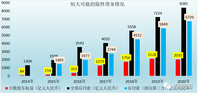恒大的債務還包括“明股實債”和上下游的應付款(包括需要兌付的各類商業票據等)兩大隱性債務,其中“明股實債”主要體現在少數股東權益科目中,而應付款雖非有息、但也是相對可觀的支出,對恒大的現金流影響較大。
