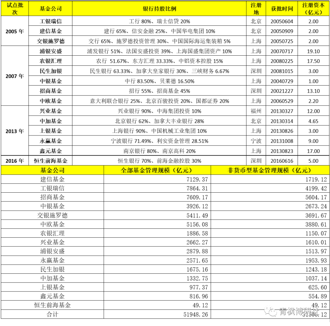 2、目前國有五大行中僅有郵儲銀行未擁有基金管理公司,股份行中僅招商銀行、民生銀行、浦發銀行、興業銀行等4家擁有基金管理公司,城商行中僅有北京銀行、上海銀行、南京銀行與寧波銀行等4家擁有基金管理公司。