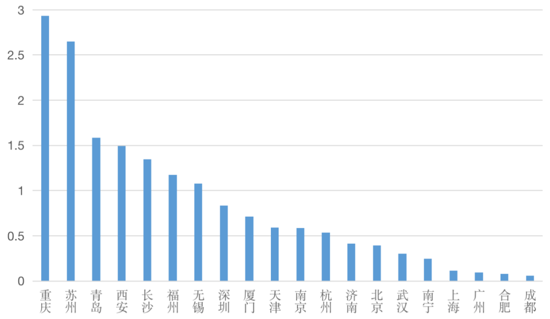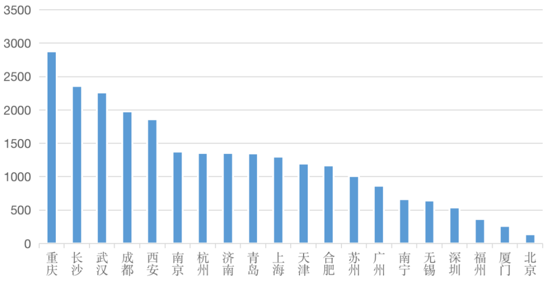 從數(shù)據(jù)看,重慶、長沙、武漢、成都等中西部城市表現(xiàn)依然強勁,重慶成交規(guī)模2877萬平方米居首位。隨著項目的建設交付,這些項目將在未來一年轉化為該城市企業(yè)拓展的對象,重慶新項目規(guī)模將進一步與其他城市拉開差距。