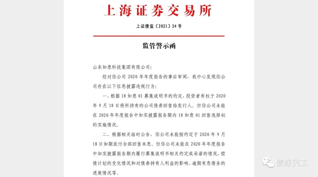 根據(jù)網(wǎng)站的公開信息,上海證券交易所于2021年5月16日向山東如意科技集團(tuán)有限公司(以下簡(jiǎn)稱“如意集團(tuán)”)出具監(jiān)管警示函,主要原因是未能披露18如意01的回售情況和未能在2020年度報(bào)告中如實(shí)披露應(yīng)履行的信息披露義務(wù)。
