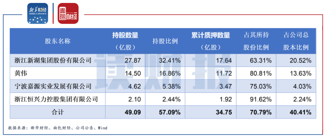 截至2021年9月4日,公司大股東新湖集團(tuán)、黃偉、寧波嘉源、恒興力控股累計(jì)未解押股權(quán)質(zhì)押數(shù)量為34.75億股,合計(jì)占其所持股份的70.79%、占公司總股本的40.41%。