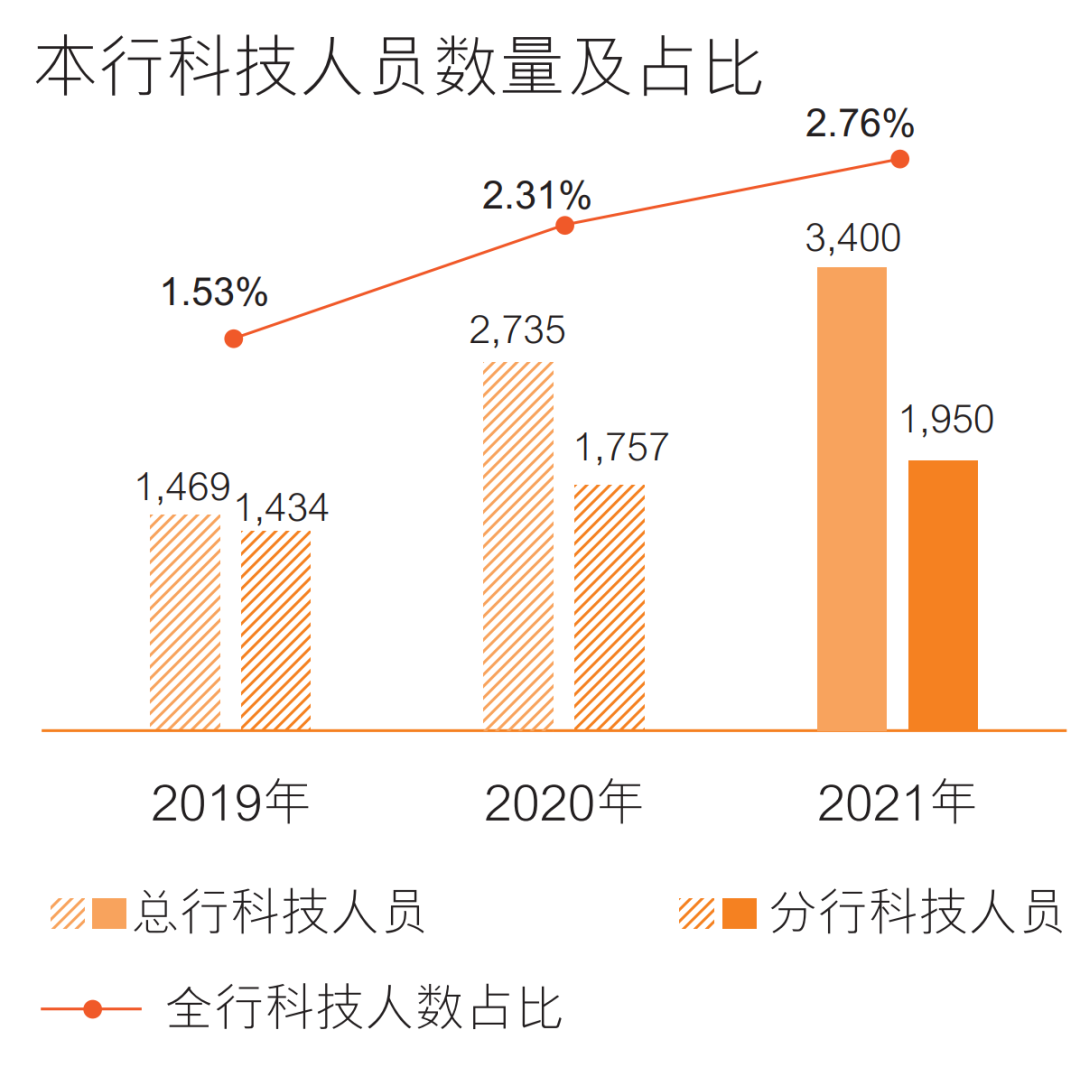 在這些金融科技賦的背后,是郵儲(chǔ)銀行不斷加強(qiáng)科技人才隊(duì)伍建設(shè)。截至2021年末,郵儲(chǔ)銀行總行IT隊(duì)伍增加到3,400人,全行超過5,300人。其中,總行科技人員中,碩士及以上學(xué)歷占比高達(dá)65%。