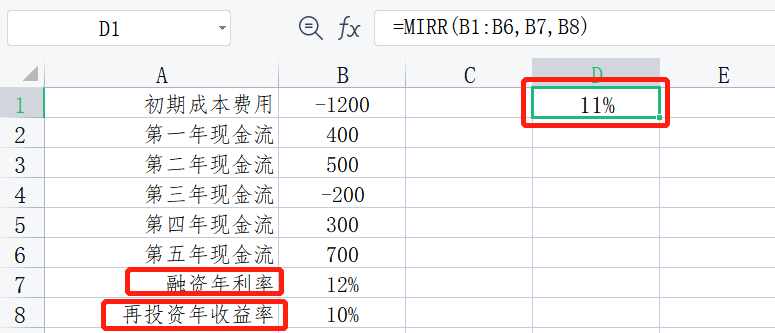 那么MIRR的公式:=(FV/PV)1/n - 1