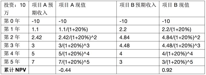 兩個項目,盡管總收入都是18.52萬,但是項目B收入來的更早,所以在時間的折現效應下,更值得投資。