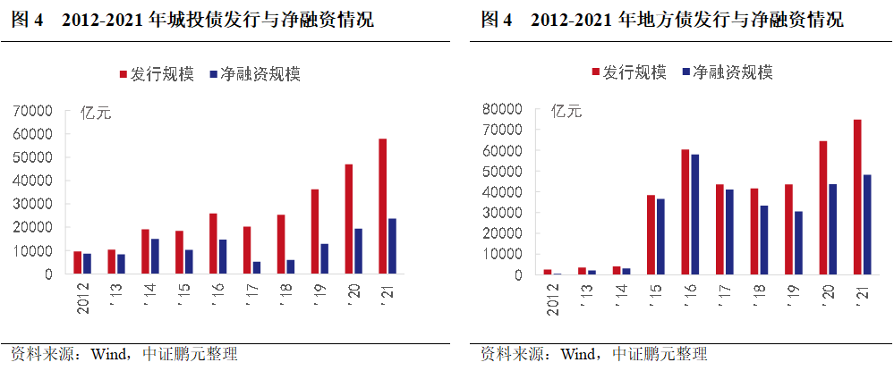 具體看2021年的重要政策和市場表現(xiàn):第一,再融資債券發(fā)行放量,城投債提前到期兌付。2021年地方再融資債發(fā)行規(guī)模合計為3.12萬億元,較2020年的發(fā)行規(guī)模(1.89萬億元)明顯增多。不完全統(tǒng)計,2021年涉及到募集資金用途變?yōu)椤皟斶€政府存量債務(wù)”的再融資債8,170億元,其中,北京、廣東和重慶分別為1,921億元、1,121億元和500億元,位列前三。受此影響,2021年城投債提前兌付情形增加。第二,城投發(fā)債門檻上升。2021年初交易所和交易商協(xié)會相繼對城投債發(fā)行進(jìn)行分類管理,根據(jù)財政部對地方政府債務(wù)風(fēng)險劃分的等級,對于紅色檔暫停發(fā)放批文、黃色檔只能借新還舊、綠色檔用途不受限制。2021年6月閃現(xiàn)的銀保監(jiān)會15號文,進(jìn)一步明確了當(dāng)前隱性債務(wù)化解的主旋律。第三,重提財政重整和城投破產(chǎn)重整/清算。2021年4月,國務(wù)院公布的《關(guān)于進(jìn)一步深化預(yù)算管理制度改革的意見》中,提出“清理規(guī)范地方融資平臺公司,剝離其政府融資職能,對失去清償能力的要依法實施破產(chǎn)重整或清算”, 12月鶴崗市政府公告實施財政重整計劃。財政重整和城投破產(chǎn)重整/清算均非首次提出,在2021年重提,體現(xiàn)了化解存量債務(wù)風(fēng)險的決心以及化解難度較大。第四,多地成立信保基金,推動國企改革,加強債務(wù)風(fēng)險分類管理。2021年來,天津、廣西、河南等地陸續(xù)成立省級信保基金,蘭州、濰坊等地成立市級信保基金,用于國有企業(yè)債務(wù)風(fēng)險化解。2021年包括城投公司在內(nèi)的國有企業(yè)改革進(jìn)程加快,明確央企債務(wù)不違約,建立地方政府債務(wù)風(fēng)險管理機制,清理高息債務(wù),調(diào)整債務(wù)結(jié)構(gòu)。例如,8月河南省發(fā)布《關(guān)于加強省管企業(yè)債務(wù)風(fēng)險管控工作的實施意見》明確,對納入債務(wù)風(fēng)險重點管控名單的企業(yè),要嚴(yán)格審核發(fā)行方案,并實施債券發(fā)行比例限制,原則上債券余額占帶息負(fù)債的比例不得超過30%, 一年內(nèi)到期債券不超過債券余額的60%。當(dāng)月福建省發(fā)布《關(guān)于加強所出資企業(yè)債務(wù)風(fēng)險管控工作的實施意見》指出,要健全完善債務(wù)風(fēng)險監(jiān)測預(yù)警機制、建立債務(wù)風(fēng)險量化評估機制、建立債務(wù)總規(guī)模動態(tài)管控機制,將債務(wù)風(fēng)險突出的下屬企業(yè)納入重點管控范圍(高于本行業(yè)上年度規(guī)模以上全部企業(yè)平均資產(chǎn)負(fù)債率加5個百分點)。